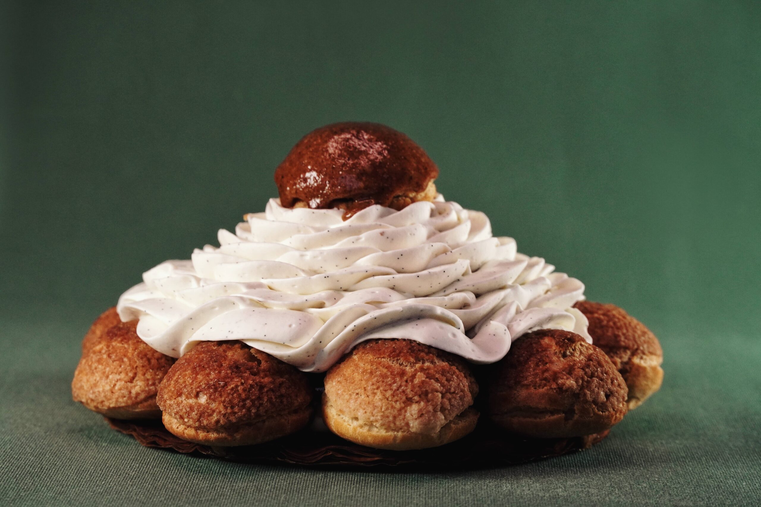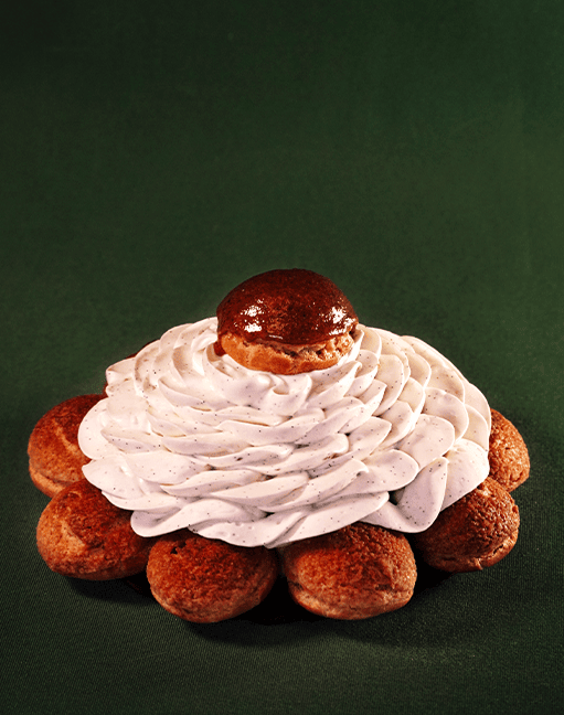 Choux garnis, crème onctueuse et fond croustillant se déclinent en parfums au choix selon la saison : vanille praliné, fruit rouges, caramel, chocolat noisette…
