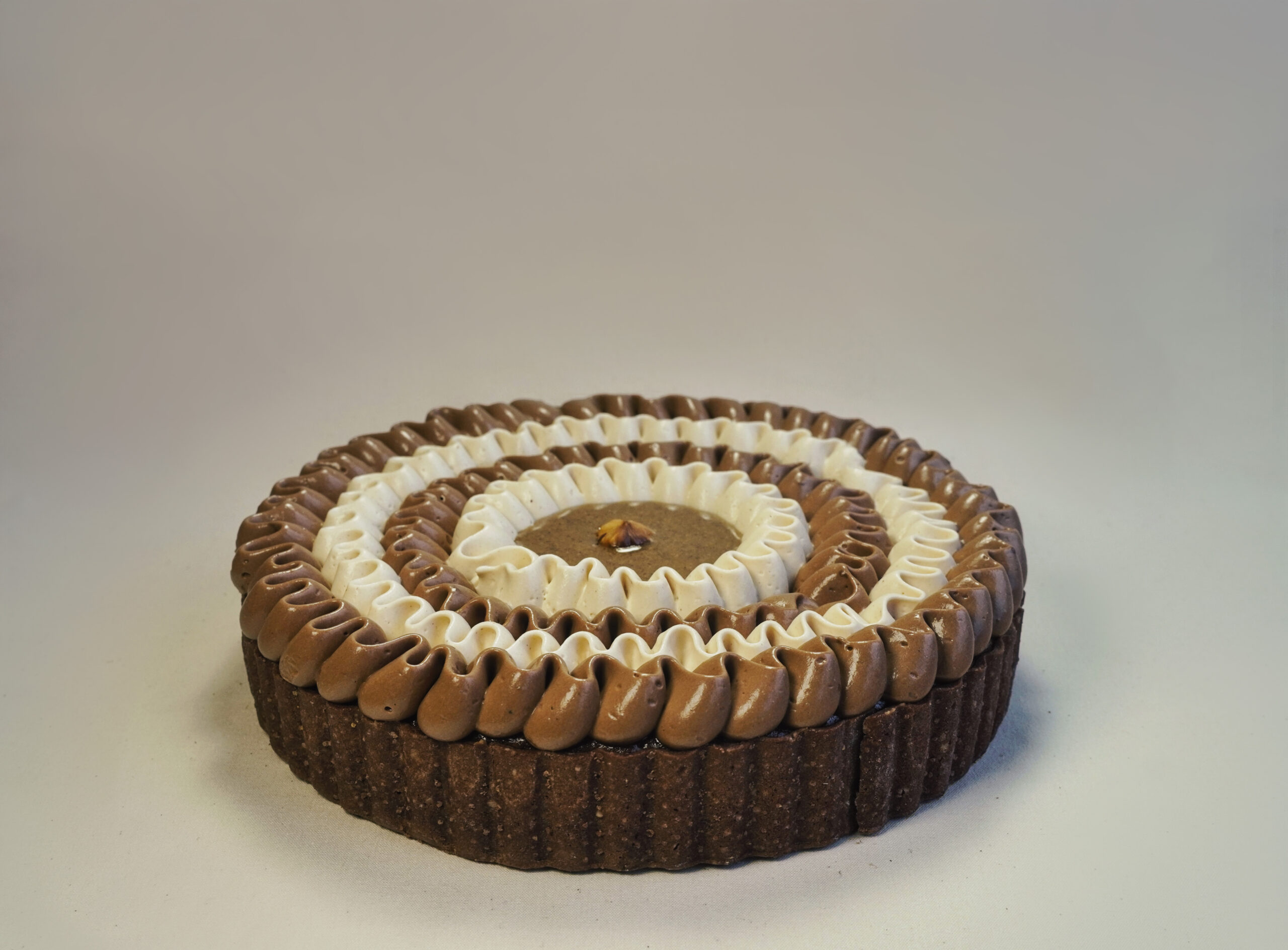 Pâte sucré chocolat, fondant au chocolat, crémeux noisette, ganache monter noisette et chocolat et praliné noisette.